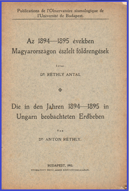 Réthly A. (1915). Az 1894-95 években Magyarországon észlelt földrengések, Egyetemi Földrengési Obszervatórium, Budapest, 74 old.