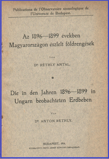 Réthly A. (1914). Az 1896-99 években Magyarországon észlelt földrengések, Egyetemi Földrengési Obszervatórium, Budapest, 53 old.