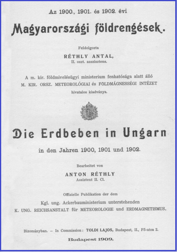 Réthly A. (1909). Az 1900, 1901 és 1902 évi magyarországi földrengések, Magyar Királyi Országos Meteorológiai és Földmágnességi Intézet, Budapest, 131 o.