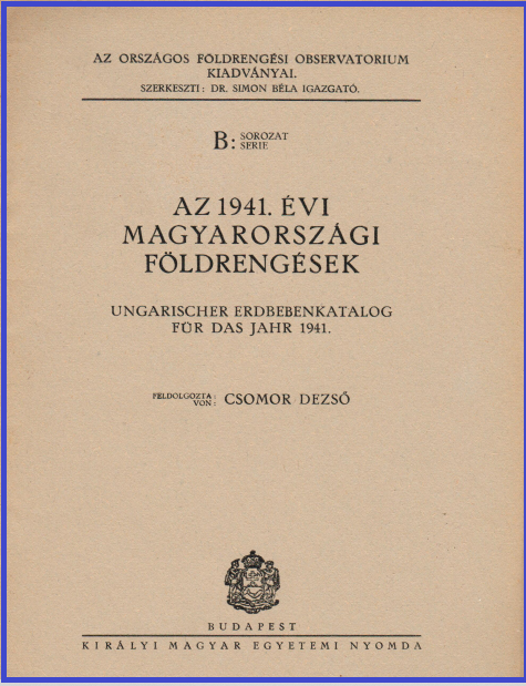 1941 Csomor D. (?) Az 1941. évi magyarországi földrengések, Országos Földrengési Obszervatórium, Budapest, 10 old.