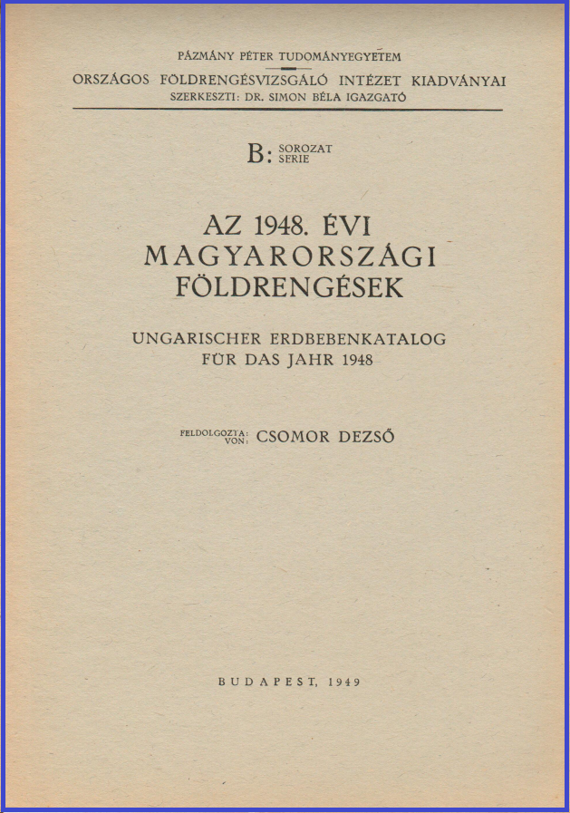 1948 Csomor D. (1949). Az 1948. évi magyarországi földrengések, Országos Földrengésvizsgáló Intézet, Budapest, 6 old.