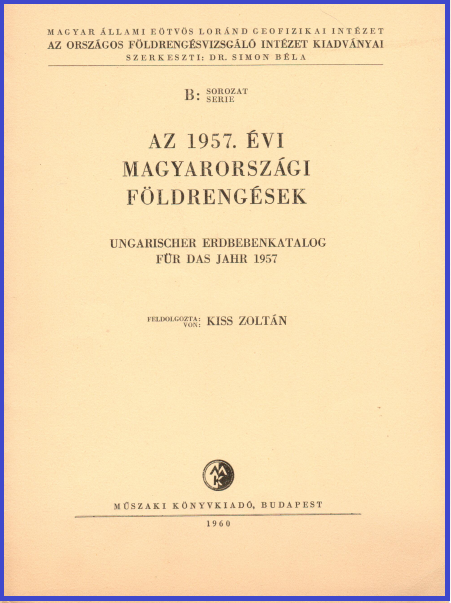 1957 Kiss Z. (1960). Az 1957. évi magyarországi földrengések, Országos Földrengésvizsgáló Intézet, Budapest, 8 old.
