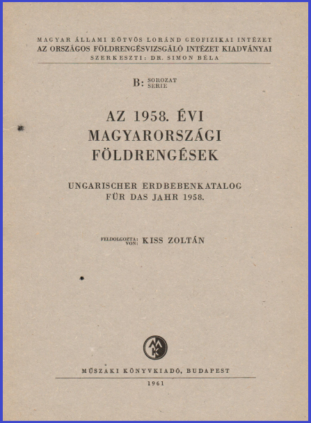 1958 Kiss Z. (1961). Az 1958. évi magyarországi földrengések, Országos Földrengésvizsgáló Intézet, Budapest, 8 old.