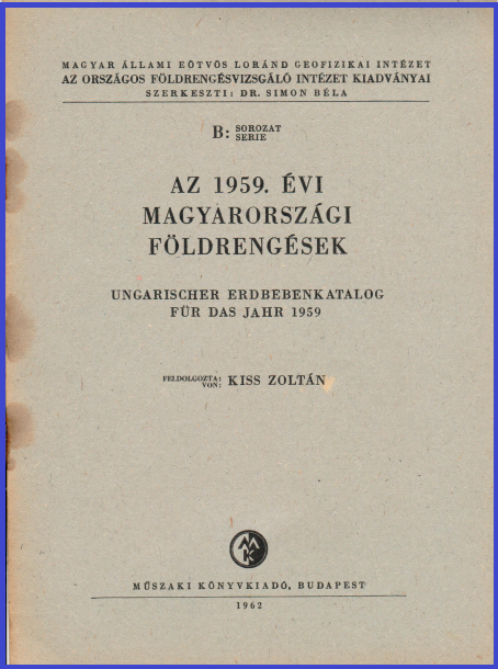 1959 Kiss Z. (1962). Az 1959. évi magyarországi földrengések, Országos Földrengésvizsgáló Intézet, Budapest, 5 old.